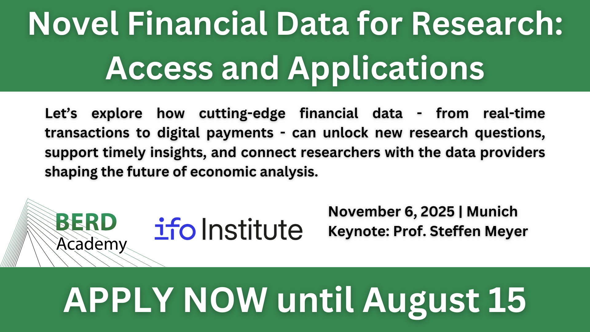 How can real-time financial data transform economic research and policy? This full-day BERD Academy workshop explores how high-frequency data – from credit card transactions to digital payments – offers new insights into behavior, regional trends, and macro dynamics, while fostering exchange between researchers and data providers.